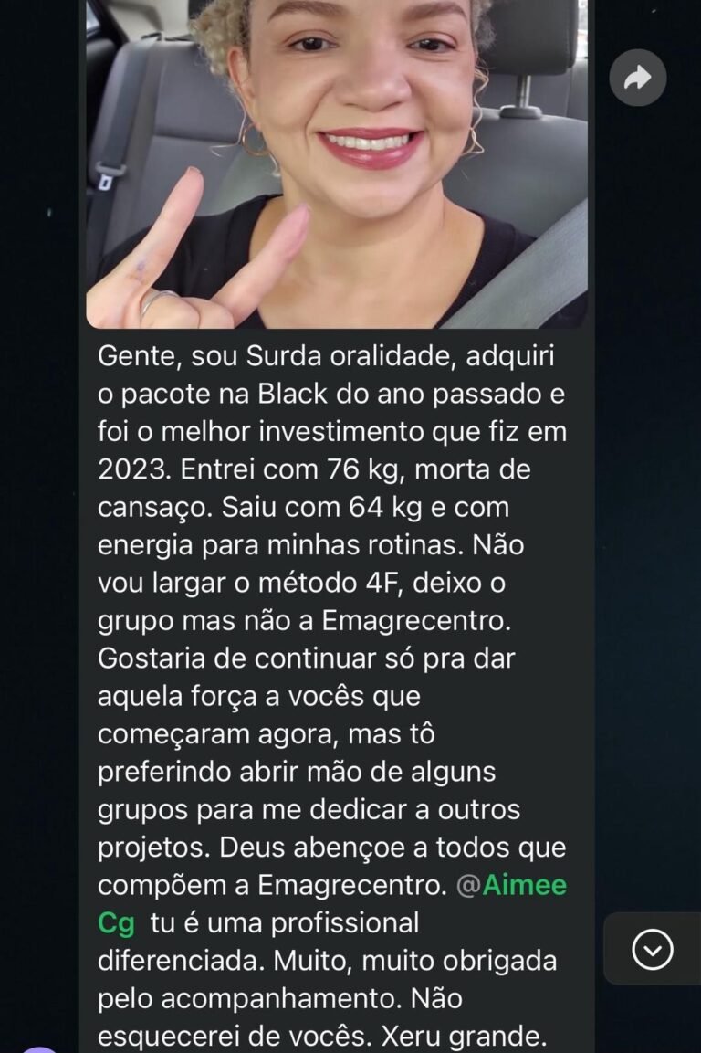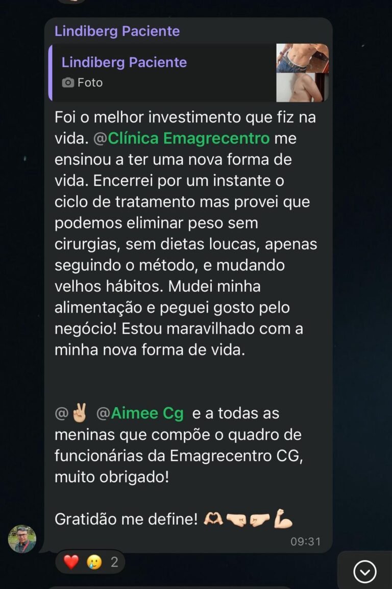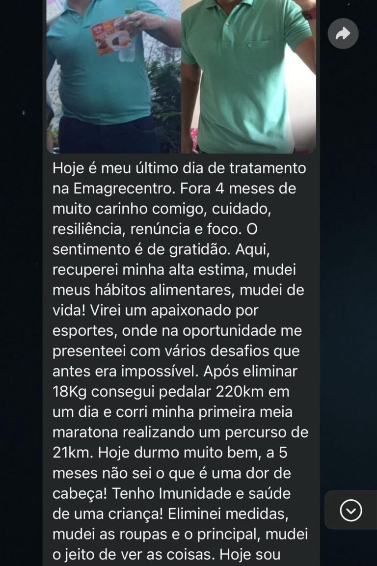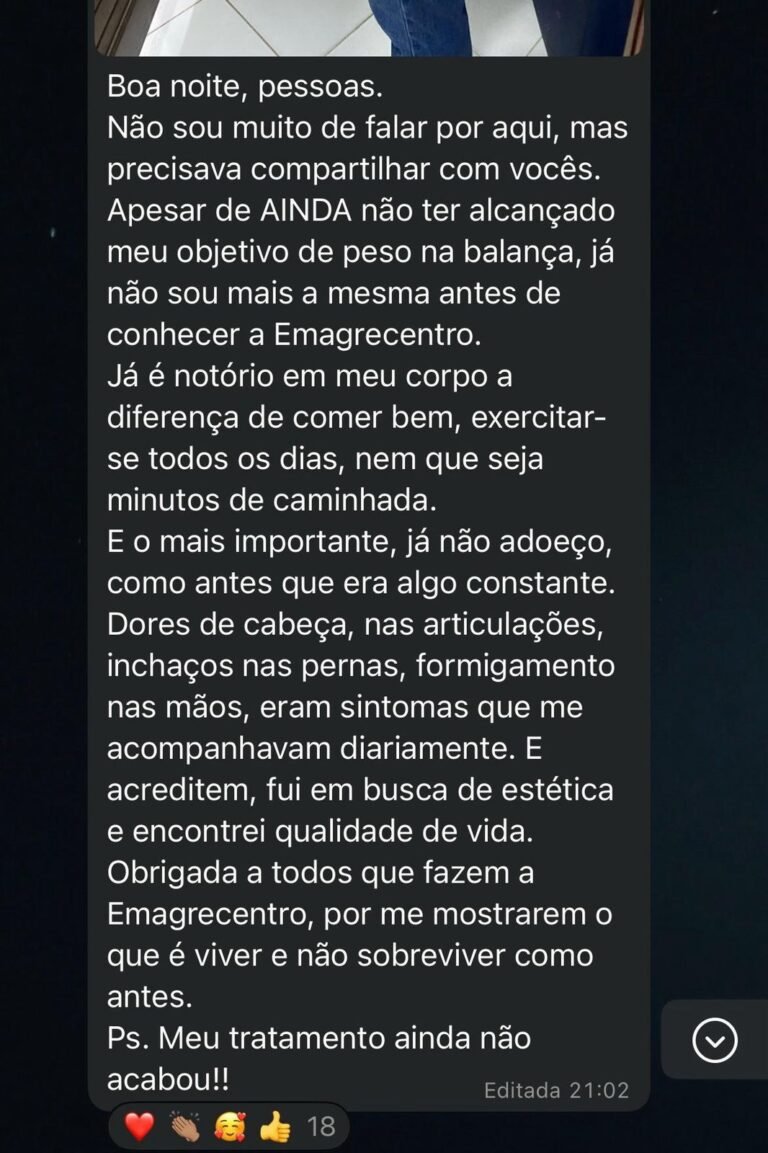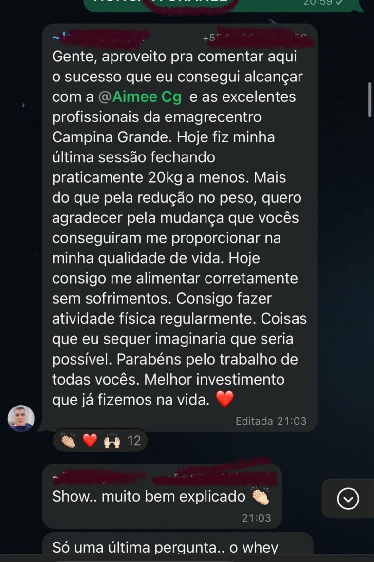 EXCELENTE Com base em 57 avaliações Publicado em Morgana Sousa lima21 Março 2025Trustindex verifica se a fonte original da avaliação é Google. Estou próximo de terminar meus protocolos e estou amando os resultados. Recomendo a emagrecentro para quem quer ter uma vida saudável.Publicado em Lindiberg Sousa Lima20 Março 2025Trustindex verifica se a fonte original da avaliação é Google. Uma clínica que realmente cuida da nossa saúde. Equipe de profissionais focados em nos promover mudanças de hábitos, mostrando que através da reeducação alimentar, é possível sim, eliminar pesos e medidas. Resgatam nossa autoestima. Eliminei 17 kg e estou mantendo até hoje. Mesmo encerrando o tratamento ainda somos ligados aos Colaboradores. Isso nos ajuda a manter o padrão que conseguimos lá.Publicado em Mayana Campos20 Março 2025Trustindex verifica se a fonte original da avaliação é Google. Ainda em andamento com meu tratamento, mas já apresentando resultados satisfatórios. Equipe atenciosa e disponível.Publicado em Ismael Costa20 Março 2025Trustindex verifica se a fonte original da avaliação é Google. Realmente funciona. Já tinha tentado de tudo. Perdi 22 kg em 5 a 6 meses. Minha esposa 15 no mesmo período. Aprendi a forma certa de me alimentar. Depois de vários meses continuo com o mesmo peso de quando terminei o emagrecimento. Adeus efeito sanfona. Mudança de estilo de vida.Publicado em Lívia Cabral20 Março 2025Trustindex verifica se a fonte original da avaliação é Google. PerfeitoPublicado em Wal Maciel20 Março 2025Trustindex verifica se a fonte original da avaliação é Google. CLÍNICA MARAVILHOSA, CUMPRE O QUE PROMETE... ATENDIMENTO E ACOMPANHAMENTO NOTA 1000 👏🏼👏🏼👏🏼👏🏼👏🏼😍Publicado em Magalí Monteiro20 Março 2025Trustindex verifica se a fonte original da avaliação é Google. Atendimento top,são muito atenciosos e competentes. Resultados impressionantes. É possível ,sim. Aprendizado pra vida ,voltei a viver.Publicado em ARTUR ARAÚJO 202420 Março 2025Trustindex verifica se a fonte original da avaliação é Google. Superou minhas expectativas, Todos que trabalham nos atendem com prazer e com muita atenção isso que nos faz se sentir bem. A Doutora Aimeé também é muito atenciosa e nos dar uma assistência muito Grande junto a Daniel, tanto presencialmente quanto através de ligações ou mensagens, nunca deixaram a desejar, super indico a Emagrecentro Campina Grande…